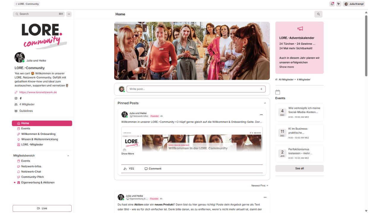 Unsere LORE.-Treffen stehen für echte Begegnungen, ehrlichen Austausch und neue Impulse. Ob offline oder jetzt auch online: Wir schaffen Räume, in denen du dich zeigen kannst, ohne Dresscode und Chichi. Regional verankert, herzlich im Miteinander und mit spürbarer Wirkung für dich und dein Unternehmen.